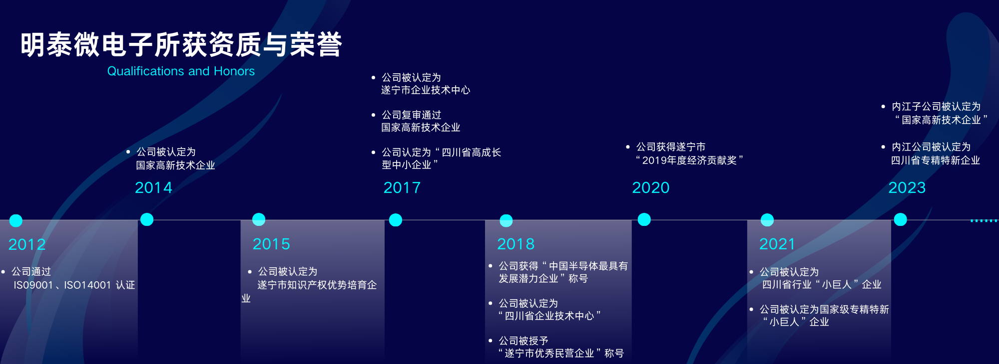 四川明泰電子科技有限公司獲得的資質(zhì)和榮譽 ?2012年,公司通過ISO9001和ISO14001認(rèn)證; 2014年,公司認(rèn)定為“國家高新技術(shù)企業(yè)”; 2015年,公司認(rèn)定為“遂寧市知識產(chǎn)權(quán)優(yōu)勢培育企業(yè)”;